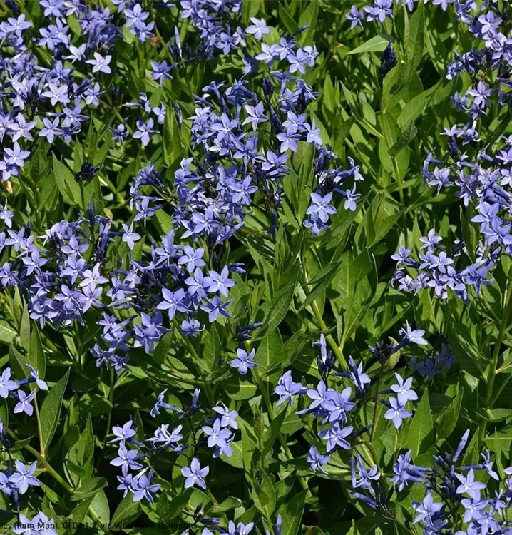 sternförmige, in Dolden angeordnete, blaue Blüten im Juni und Juli