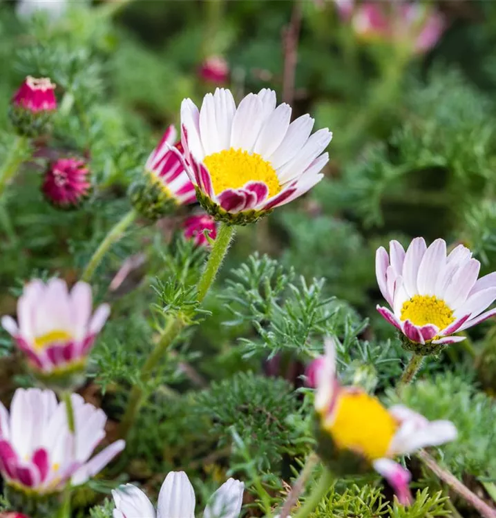 weiße Korbblüten mit gelber Mitte und roter Rückseite, Blüte von Mai bis Juli