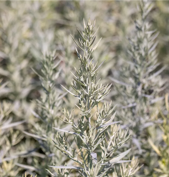 Hoher Blattschmuckwert. Die sommergrünen Blätter der Silberraute 'Silver Queen' sind silbrig, lanzettlich.