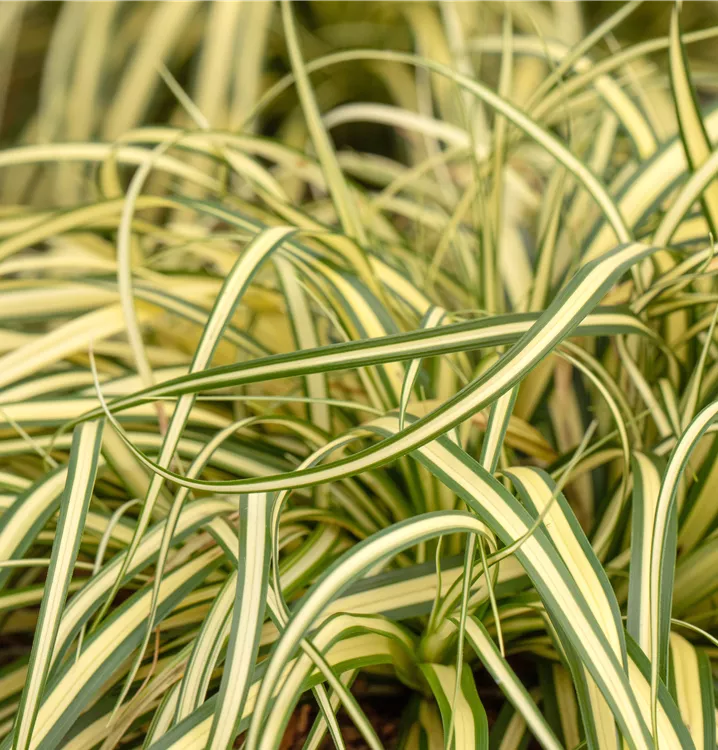 An den äußeren Rändern setzen wir die filigrane Carex hachijoensis 'Evergold' (Segge) ein, deren elegantes, feines Gras mit gelbem Rand dem Arrangement eine lebendige Umrahmung verleiht. Direkt daneben bringen die Heuchera (Purpurglöckchen) mit ihren farbenfrohen und abwechslungsreichen panaschierten Blättern einen wunderschönen Kontrast und eine interessante Textur ins Spiel. Im Zentrum des Blumenkastens wächst die immergrüne, kräftig wachsende Vinca major 'Variegata', die als hängender Blickfang mit ihren frisch-grünen, cremeweiß panaschierten Blättern begeistert und sich jederzeit nach Belieben zurückschneiden lässt, um die Form und das harmonische Gesamtbild zu bewahren.