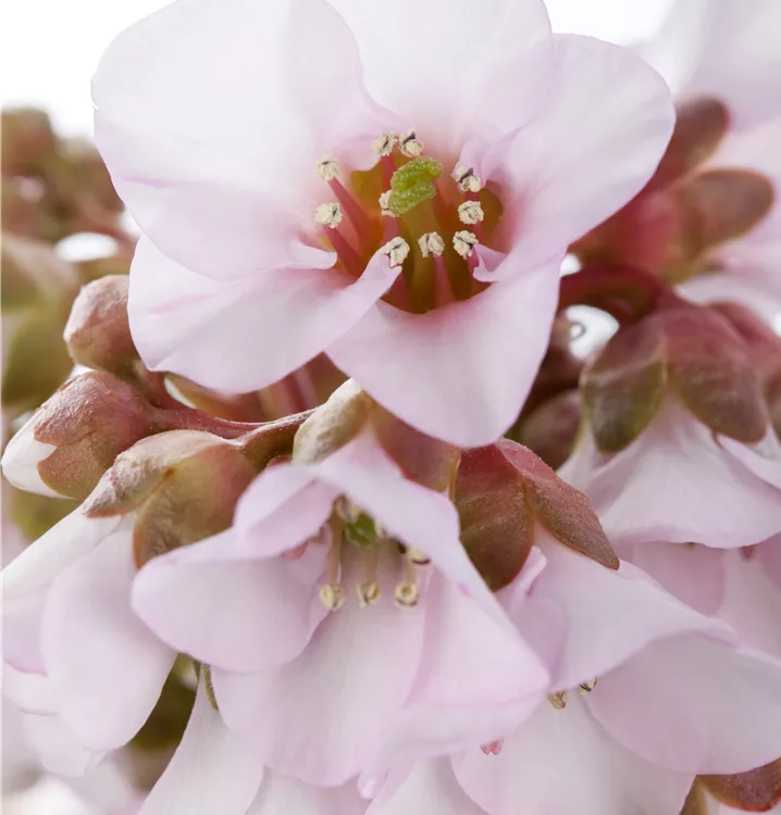 Bergenia cordifolia 'Spring Fling' bildet glockenförmige, in Dolden angeordnete, hellrosafarbene Blüten ab März. Bei richtiger Pflege Nachblüte von November bis Dezember.