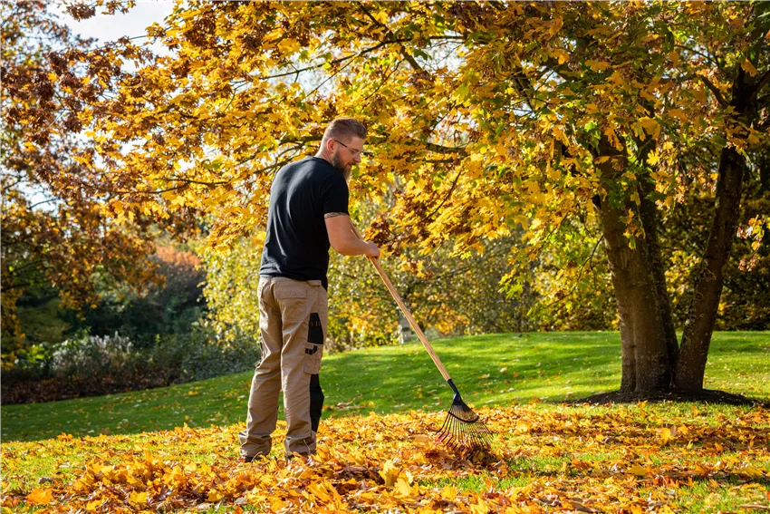 Gartengeräte - Mann harkt Laub Bei der Gartenarbeit im September ist es für Gartenliebhabern die perfekte Gelegenheit, ihre grünen Oasen auf die kommende Saison vorzubereiten und zu pflegen.