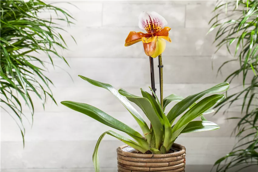 Paphiopedilum 'Americana' Weniger bekannt, dafür aber mindestens genauso hübsch sind Frauenschuh-Orchideen. Sie strahlen eine ganz besondere Exotik aus, denn man sieht ihnen ihre Heimat an. Ursprünglich kommen sie von den pazifischen Inseln und aus den Wäldern Ostasiens und haben sich hierzulange als Zimmerpflanze längst einen Namen gemacht. Und auch, wenn sie noch nicht in jedem Wohnzimmer oder Büro stehen, sind sie ein echter Geheimtipp für Pflanzenfans. Ihr Markenzeichen ist ihre schuhförmige Blütenlippe, die sich vom Herbst bis zum Frühjahr an den Pflanzen zeigt. Mit der richtigen Pflege können Pflanzenfans eine der beliebtesten Orchideen ganz einfach zum Blühen bringen und haben dann viel Freude mit den exotischen Schönheiten. Dafür sollte der Standort hell sein, aber keine direkte Sonneneinstrahlung bieten. Eine hohe Luftfeuchtigkeit sind die Pflanzen aus ihrer Heimat gewöhnt und bevorzugen diese auch in unseren vier Wänden. Eine Besonderheit gibt es aber auch bei dieser beliebten Orchidee: Frauenschuh-Orchideen mit gemusterten Blüten können sonniger und wärmer stehen, als die einfarbigen Kandidaten.