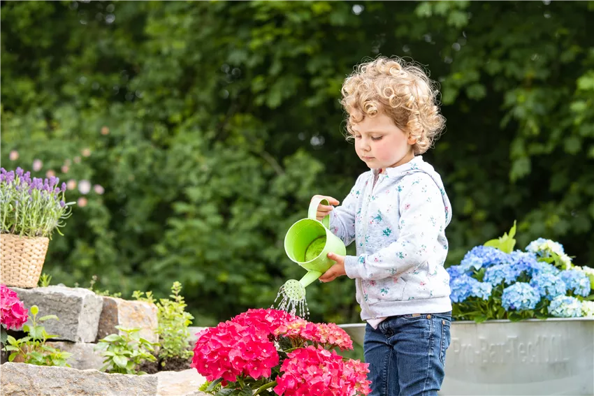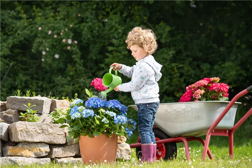 Muttertag - Kind gießt Hortensie Gärtner, die mit großer Hingabe und Liebe ihre Hortensien pflegen, werden jedes Jahr aufs Neue mit einem Meer aus Blüten belohnt.
