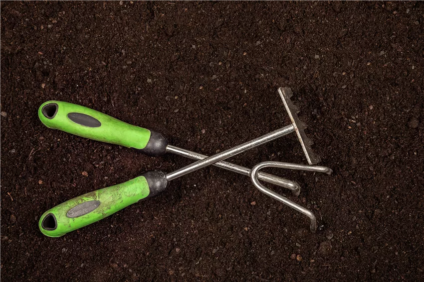 Gartenwerkzeuge auf Erde Bevor die neue Gartensaison beginnt und es ans Aussäen geht, müssen spätestens im März an frostfreien Tagen Unkräuter aus den Beeten entfernt werden. Nicht immer muss der Garten umgegraben werden. Denn mit jedem Umgraben wird das harmonische Gleichgewicht der im Boden lebenden Mikroorganismen gestört. Oft genügt es, den Boden mit der Grabegabel oder dem Grubber zu lockern. Ebenso kann das vorsichtige Einarbeiten von Kompost und organischem Dünger die Bodenqualität nachhaltig verbessern. Nur neu anzulegende Beetflächen müssen umgegraben und bearbeitet werden, damit zur Aussaatzeit eine Fläche mit feiner Erdkrume bereitliegt. Ansonsten ist ein gut gelockerter und durchlässiger Boden die Grundvoraussetzung für gesundes Pflanzenwachstum. Denn nur dann können die noch jungen Wurzeln zu einem starken Wurzelwerk heranwachsen und auch ausreichend Nährstoffe aufnehmen.