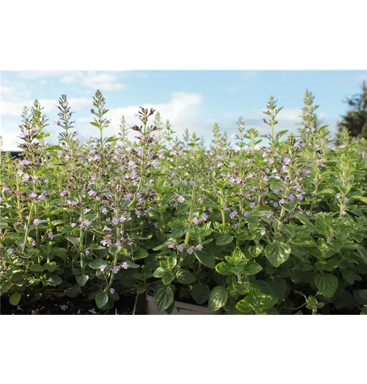 Die Kleinblütige Garten-Bergminze 'Blue Cloud' (Calamintha nepeta) ist eine aufrechte, horstbildende Staude, die von Juli bis September blauviolette, lippenförmige Blüten mit einem angenehmen Duft bildet. An einem sonnigen bis halbschattigen Standort mit durchlässigem, humosem, lockerem, nährstoffreichem Boden erreicht sie gewöhnlich eine Höhe von ca. 60 cm und wird ca. 40 cm breit. Die Kleinblütige Garten-Bergminze 'Blue Cloud' ist gut frostverträglich.