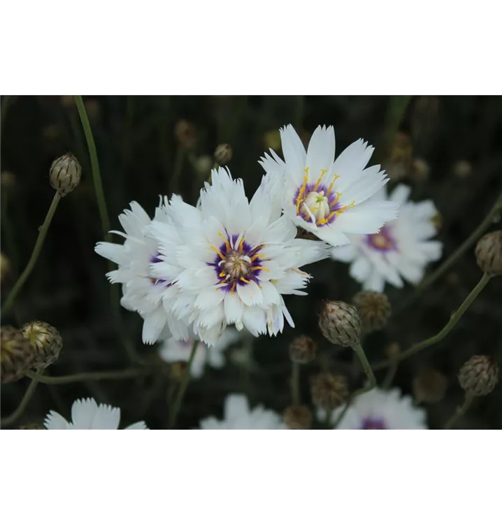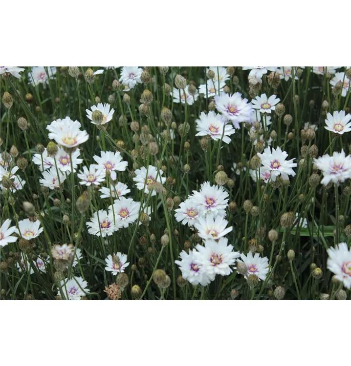 Die Garten-Rasselblume 'Alba' (Catananche caerulea) bildet weiße Blüten von Juli bis August. Sie bevorzugt durchlässigen, nährstoffreichen Boden in sonniger Lage. Die Garten-Rasselblume 'Alba' ist gut frostverträglich. Die aufrechte Staude erreicht gewöhnlich eine Höhe von ca. 60 cm.