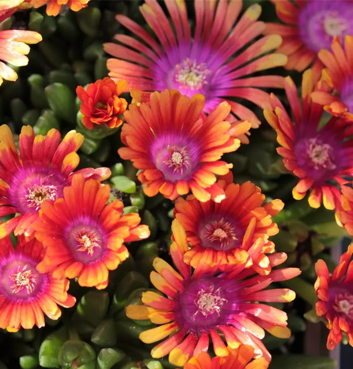 Eine herausragende Sorte ist Delosperma ‘Firespinner’, eingeführt von Panayoti Kelaidis aus Südafrika. Sie wächst flach und teppichbildend, blüht außergewöhnlich reich und zeigt ein leuchtendes Farbspiel in Orange mit violettem Zentrum. Nach einem intensiven Blütenschub im Mai und Juni folgt oft ein leichter Nachflor bis in den September. Mit Regenschutz übersteht sie den Winter problemlos und zählt zu den schönsten Mittagsblumen für sonnige Steingärten und Gefäße.