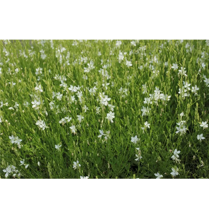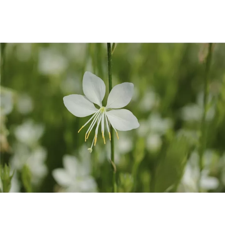 Gaura lindheimeri 'Snowbird' bildet in Rispen angeordnete, weiße Blüten mit weißen Staubfäden ab Juli.
