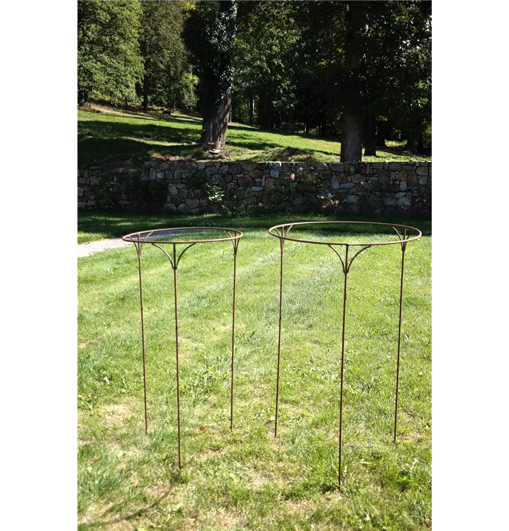Der Staudenhalter 'Achil' mit seinem Durchmesser von 50cm und einer Höhe von 100cm hilft jeder Pflanze die nicht so ganz standfest ist. Hier können sich die Triebe der Pflanze abstützen und selbst der Wind hat nur noch wenige Chancen diese abzuknicken. Mit seinem Rostoptik-Look fügt sich der Staudenhalter malerisch in die Pflanzung ein. Linker Staudenhalter auf dem Bild.
