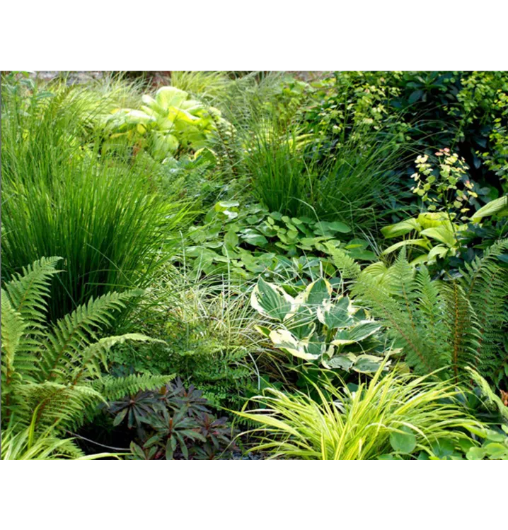 Ein schattiger Garten ist die perfekte Bühne für die blattschmuckbetonte Staudenmischung "Schattengold". Die niedrige Mischung rückt höhere Gräser und panaschierte bzw, gelbgrüne Funkien in den Fokus.