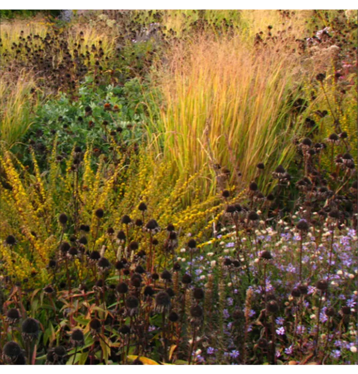Purpur, rosa und weiße Blütenfarben werden von blau-violetten Akzenten begleitet. Durch die speziell aufeinander abgestimmte Sortenzusammenstellung können Staudenmischungen das ganze Jahr über durch Blüten, Blattwerk und Winteraspekte punkten.