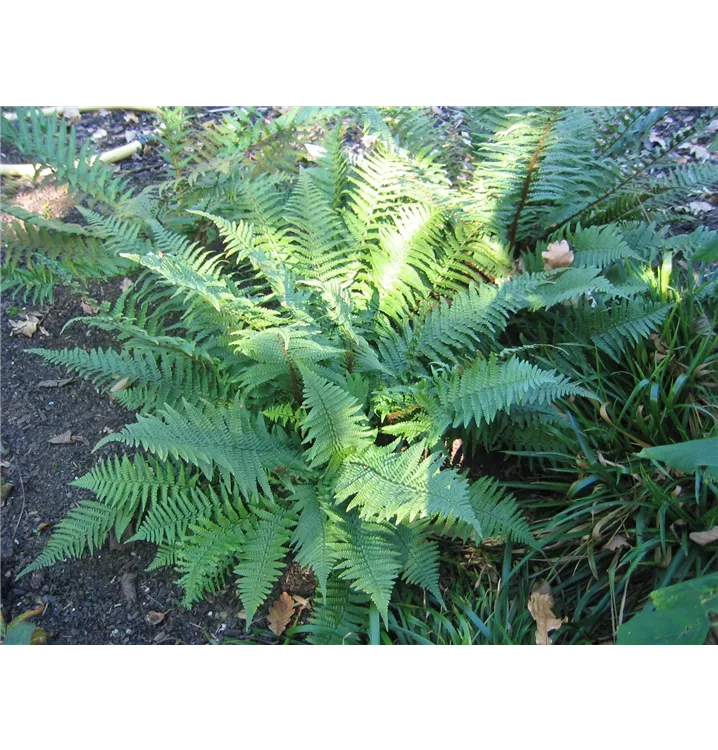 Der Goldschuppenfarn (Dryopteris affinis) ist mit seiner dunkelgrünen Blattfärbung ein dekoratives Gestaltungselement im Garten, welches sich an einem halbschattigen bis schattigen Standort mit einem möglichst durchlässigen, humosen Boden am wohlsten fühlt. Bei günstigen Bedingungen erreicht diesen winterhartn Farn eine Höhe von ca. 80 cm und wird bis zu 80 cm breit.