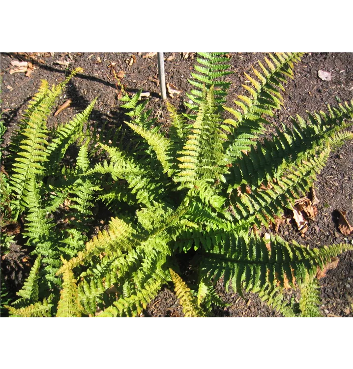 Der Schmale Goldschuppenfarn 'Pinderi' (Dryopteris affinis) ist mit seiner dunkelgrünen Blattfärbung ein dekoratives Gestaltungselement im Garten, welches sich an einem halbschattigen bis schattigen Standort mit einem möglichst durchlässigen, humosen Boden am wohlsten fühlt. Bei günstigen Bedingungen erreicht diesen winterhartn Farn eine Höhe von ca. 70 cm und wird bis zu 50 cm breit.