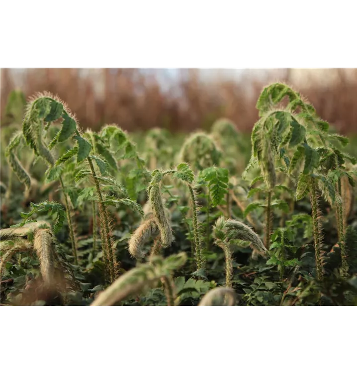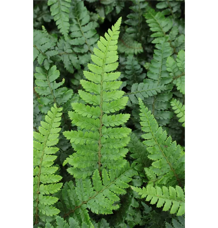 Hoher Blattschmuckwert. Die immergrünen Blätter des Japanischen Glanz-Schildfarns sind glänzend, mittelgrün, gefiedert.