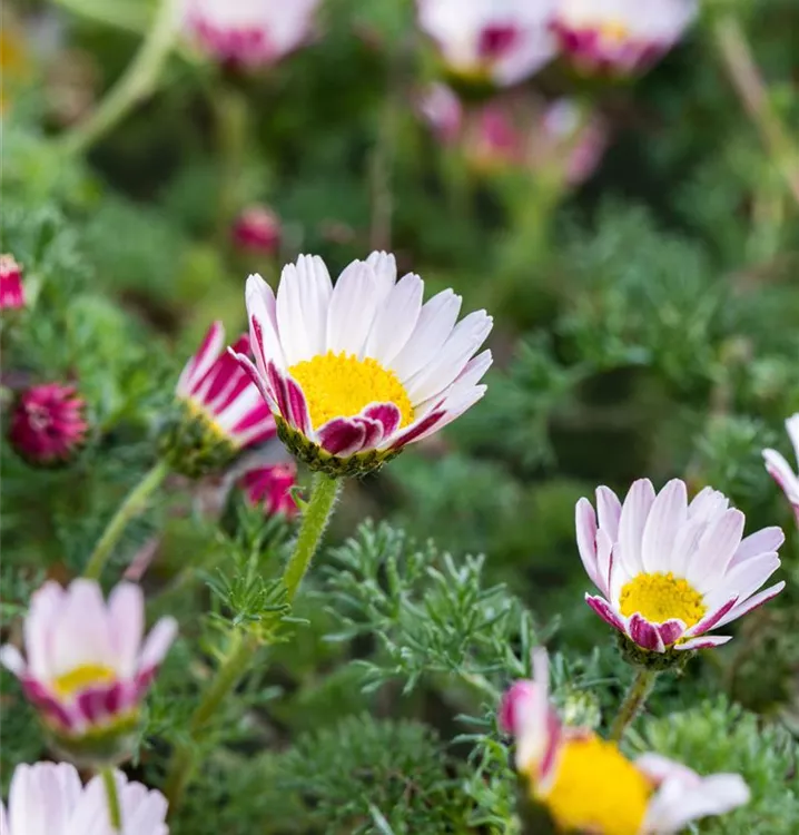 Die Kreisblume (Anacyclus pyrethrum var. depressus) ist eine polsterbildende wintergrüne Staude, die von Mai bis Juni weiße, radförmige Blüten bildet. An einem sonnigen Standort mit durchlässigem, humosem Boden erreicht sie gewöhnlich eine Höhe von ca. 15 cm und wird ca. 20 cm breit. Die Kreisblume ist gut frostverträglich.