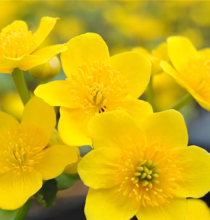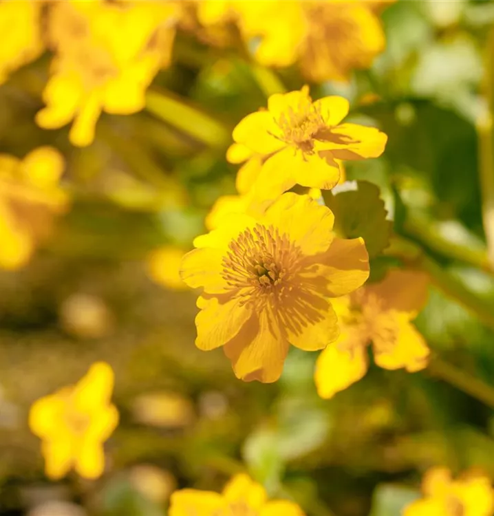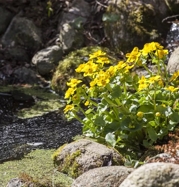 Die Sumpf-Dotterblume (Caltha palustris) ist mit ihren dunkelgrünen Blättern eine ausgesprochen dekorative Wasserpflanze, die für solche Einsatzbereiche wie Teichrand, Bachlauf, Teich und Bienenweide besonders gut geeignet ist. Goldgelbe, angenehm duftende Blüten erscheinen von März bis Mai. Sie bevorzugt lockeren, sandigen Boden in sonniger bis schattiger Lage. Die Sumpf-Dotterblume ist gut frostverträglich. Die horstbildende Staude erreicht gewöhnlich eine Höhe von ca. 50 cm.