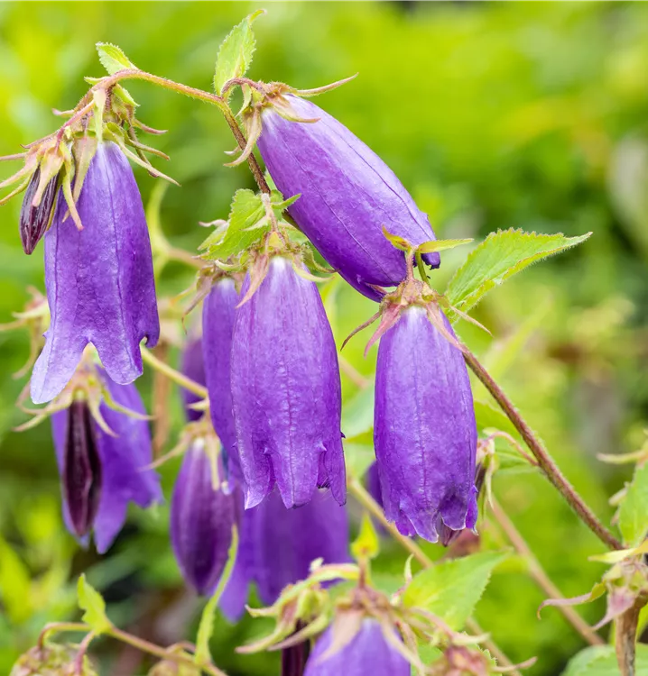 Campanula punctata 'Sarastro' bildet glockenförmige, violette Blüten ab Juni.