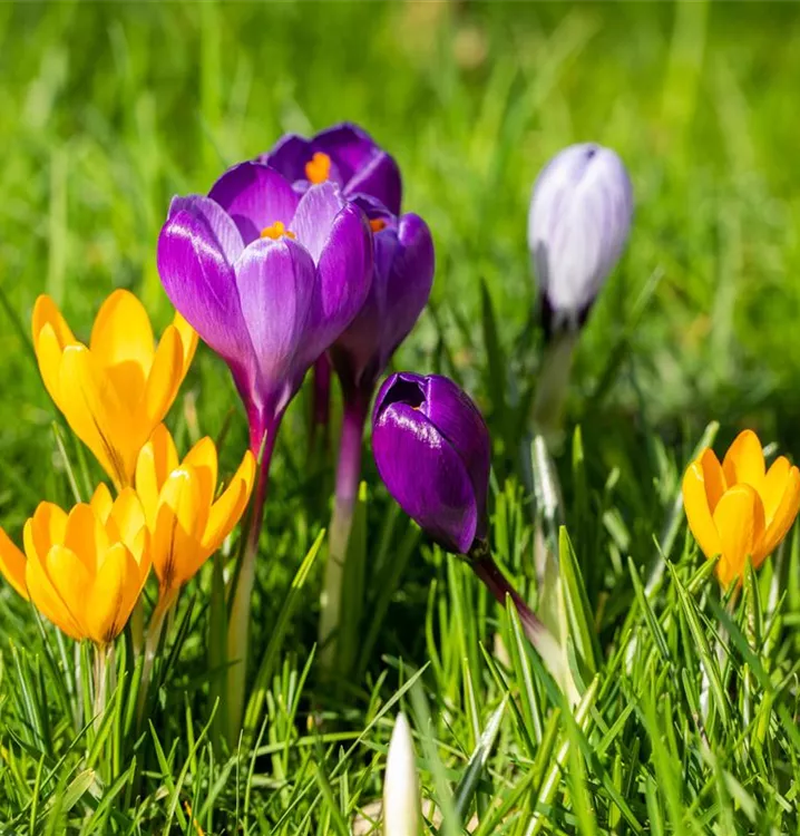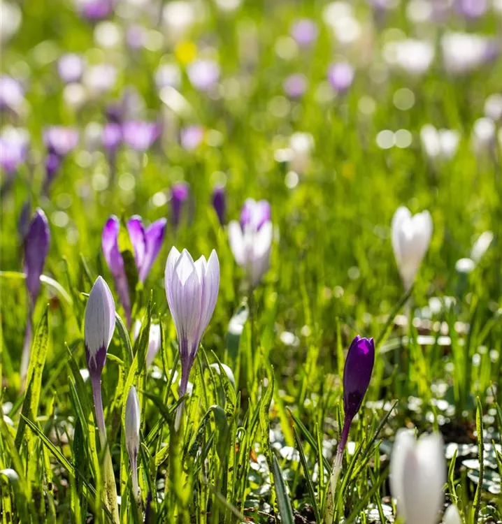Die Botanische Krokusse (Crocus 'Spezies Mischung') blüht über Monate hinweg. Je nach Sorte, erscheinen die dekorativen Blüten in den Farben Blauviolett, Cremegelb und Weiß. Bevorzugt wird ein sonniger bis halbschattiger Standort und eine durchlässige Erde.