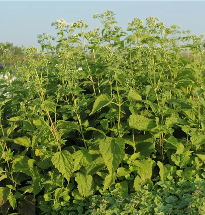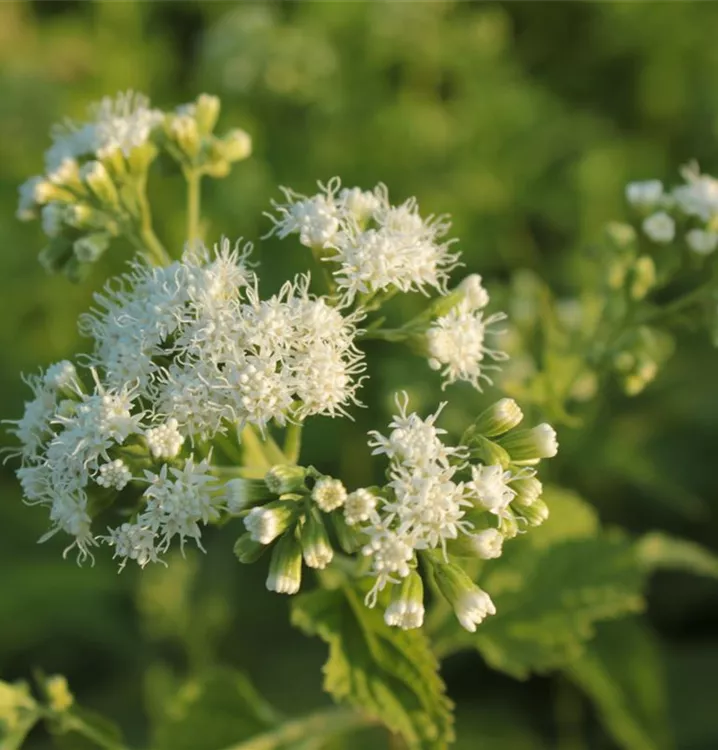 Eupatorium rugosum bildet in Doldentrauben angeordnete, weiße Blüten ab August.