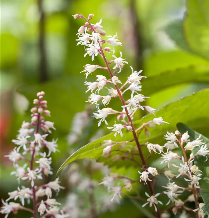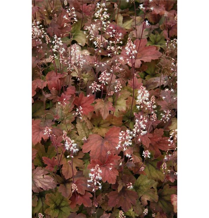 Heucherella 'Sweet Tea'® bildet cremeweiße, hellrosafarbene, hellrote, weiße Blüten ab Juni.