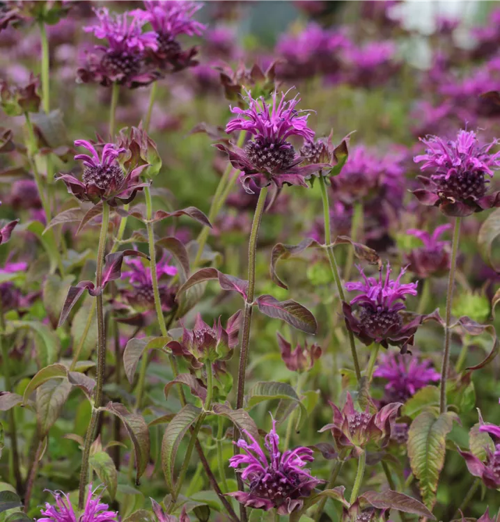 Die Indianernessel 'Scorpion' (Monarda fistulosa 'Scorpion') hat von Juli bis August kräftig violette Blüten und intensiv violett-purpurfarbene Hochblätter. Wuchshöhe: ca. 140 cm, Breite: etwa 60 cm.