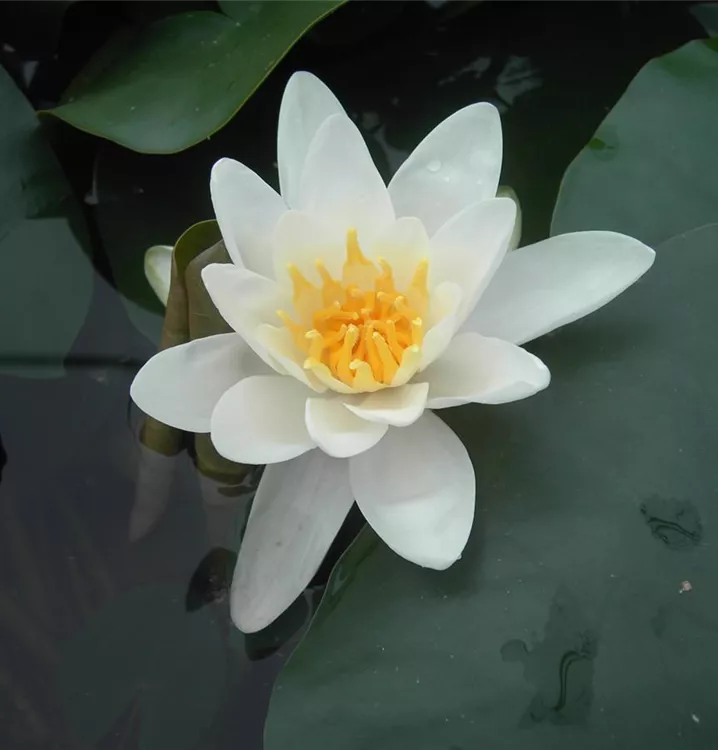Die Garten-Seerose 'Gladstoniana' (Nymphaea) ist mit ihren dunkelgrünen Blättern eine ausgesprochen dekorative Wasserpflanze, die für solche Einsatzbereiche wie Teich besonders gut geeignet ist. Weiße Blüten erscheinen von Juni bis September. Sie bevorzugt humosen, nährstoffreichen Boden in sonniger Lage. Die Garten-Seerose 'Gladstoniana' ist gut frostverträglich. Die flache Staude erreicht gewöhnlich eine Höhe von ca. 10 cm.