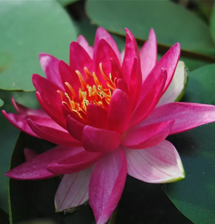 Die Garten-Seerose 'Escarboucle' (Nymphaea) ist mit ihren dunkelgrünen Blättern eine ausgesprochen dekorative Wasserpflanze, die für solche Einsatzbereiche wie Teich besonders gut geeignet ist. Dunkelrote Blüten erscheinen von Juni bis September. Sie bevorzugt humosen, nährstoffreichen Boden in sonniger Lage. Die Garten-Seerose 'Escarboucle' ist gut frostverträglich. Die flache Staude erreicht gewöhnlich eine Höhe von ca. 10 cm.