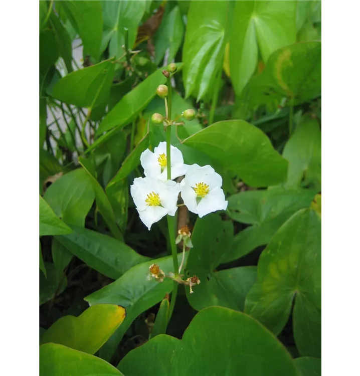 Das Gewöhnliche Pfeilkraut (Sagittaria sagittifolia) ist mit seinen mittelgrünen Blättern eine ausgesprochen dekorative Wasserpflanze, die für solche Einsatzbereiche wie Kübel, Teichrand, Bachlauf, Teich und Bienenweide besonders gut geeignet ist. Weiße Blüten erscheinen von Juni bis August. Es bevorzugt humosen, feuchten bis nassen Boden in sonniger bis halbschattiger Lage. Das Gewöhnliche Pfeilkraut ist gut frostverträglich. Die aufrechte, horstbildende Staude erreicht gewöhnlich eine Höhe von ca. 40 cm.