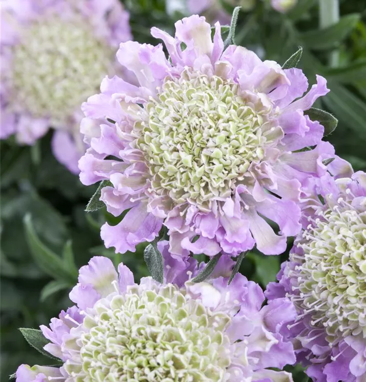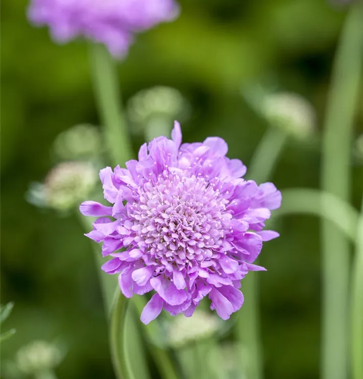 Scabiosa columbaria 'Pink Mist' bildet schalenförmige, rosafarbene Blüten ab Mai.