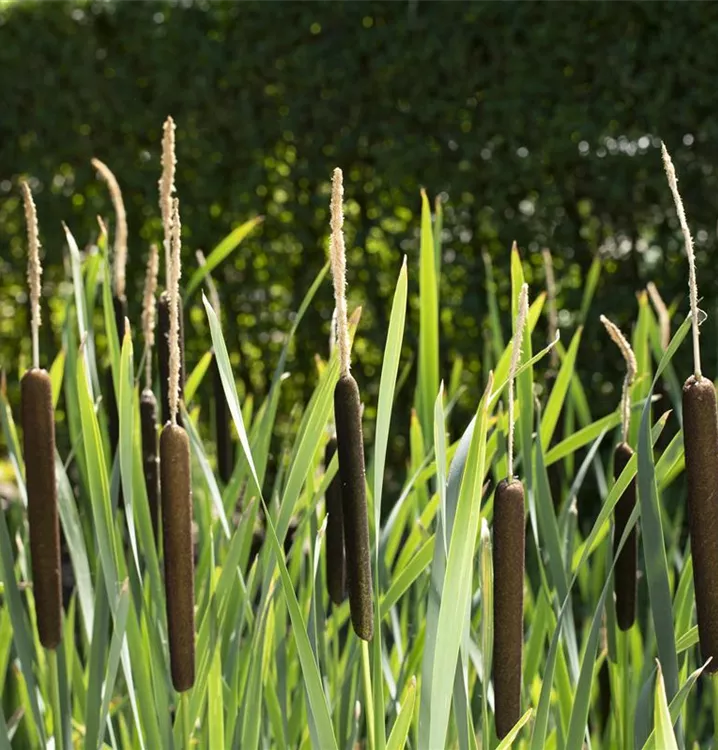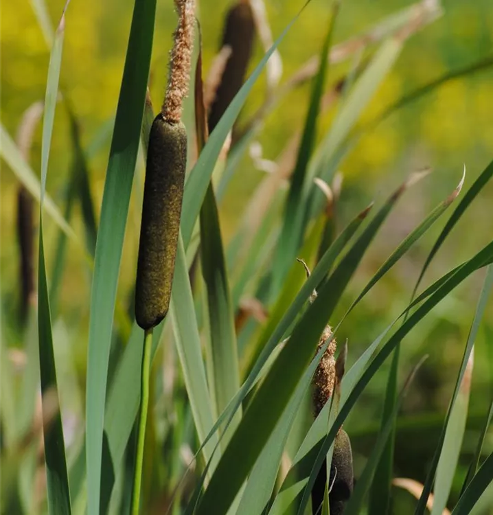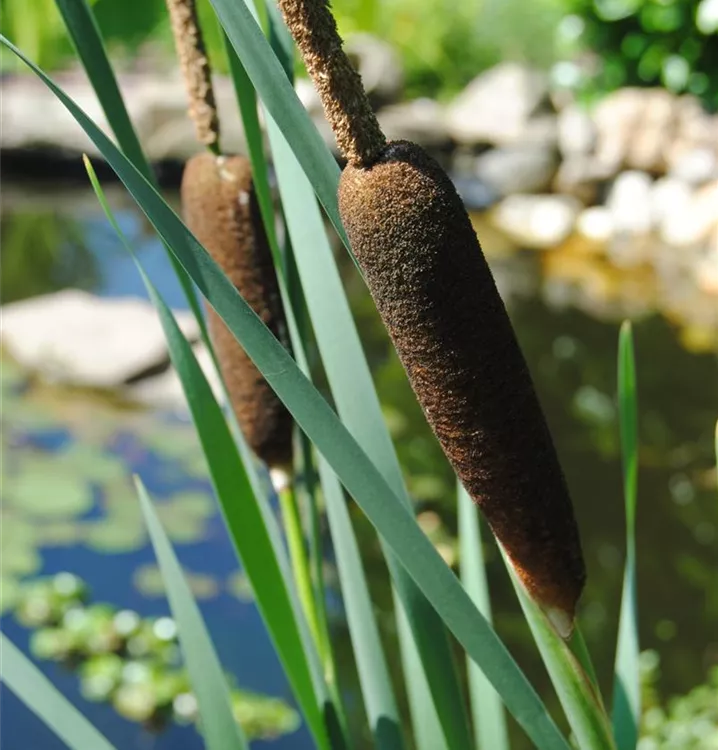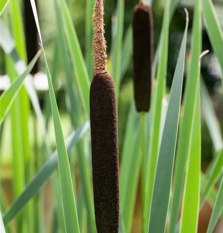 Im Gartenteich braucht der Schmalblättrige Rohrkolben einen vollsonnigen Standort auf schlammig-sandigen Lehmböden mit einer Wassertiefe von 50 - 70 cm. Da er sich über seine Ausläufer rasch ausbreiten und alles andere überwuchern würde, sollte er nur in stabile Kübel gepflanzt werden. Kennzeichnend für diese Art sind seine langen, schmalen Blätter, die den braunen, kolbenartigen Blütenstand überragen.