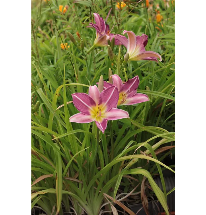 Die Garten-Taglilie 'Lavender Organdy' (Hemerocallis) ist eine aufrechte Staude, die von Juni bis September weiße, gelbe, orangefarbene, rosafarbene, trichterförmige Blüten mit einem angenehmen Duft bildet. An einem sonnigen Standort mit durchlässigem, nährstoffreichem Boden erreicht sie gewöhnlich eine Höhe von ca. 90 cm und wird ca. 90 cm breit. Die Garten-Taglilie 'Lavender Organdy' ist gut frostverträglich.