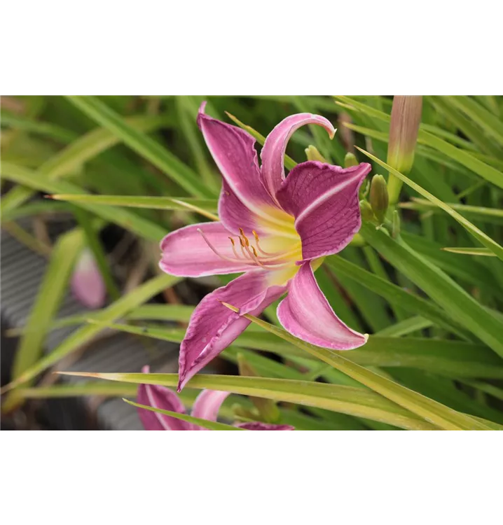 Die sommergrünen Blätter der Garten-Taglilie 'Lavender Organdy' sind mittelgrün, lanzettlich.