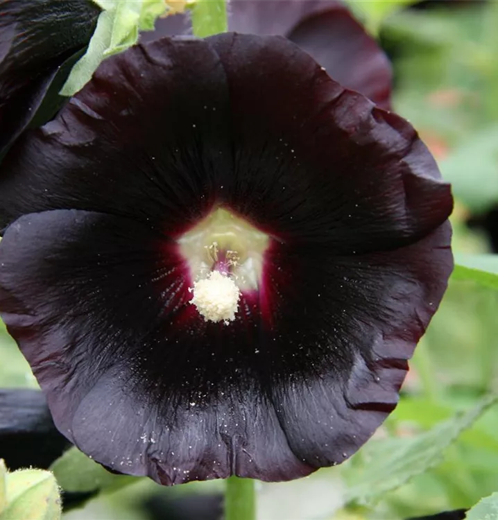 Alcea rosea 'Nigra' bildet schalenförmige, in Ähren angeordnete, schwarz-rote Blüten ab Juli.
