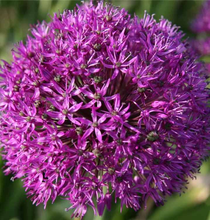 Allium 'Purple Sensation' blüht etwas früher als andere Sorten, nämlich schon ab Mai. Die doldigen Blütenstände sind kugelrund, haben einen Durchmesser von etwa 10 cm und blühen leuchtend Rotviolett.