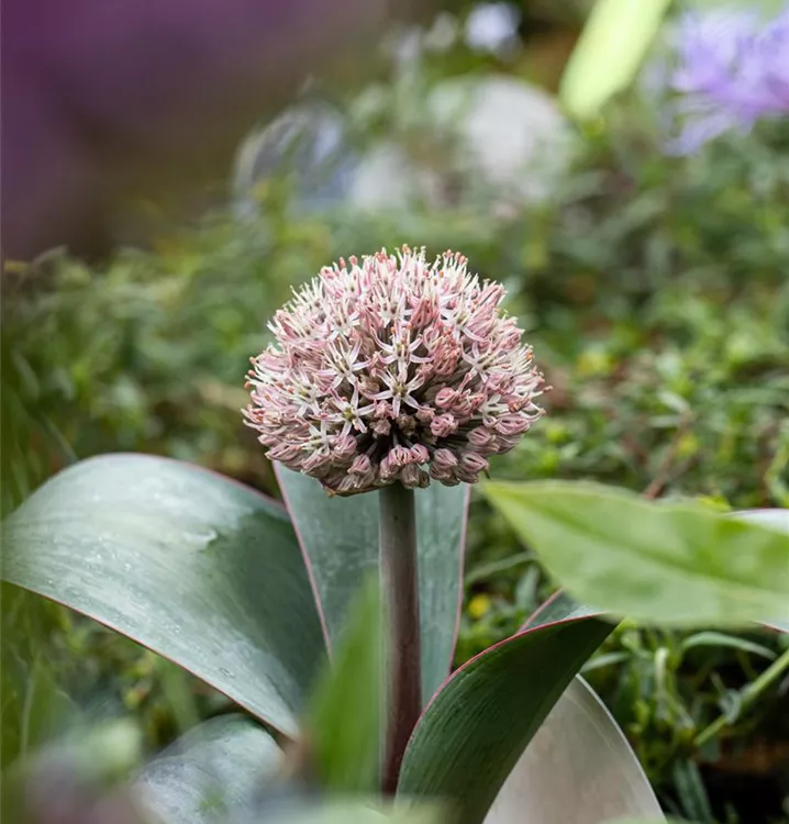 Allium karataviense ist ein Zierlauch aus aus dem Karatau-Gebirge in Kasachstan, daher der Artname. Schon im Austrieb fallen die breit-elliptischen, graugrünen Laubblätter ins Auge. Sie erscheinen stets paarweise und haben einen attraktiven violetten Rand oder sind gesprenkelt.