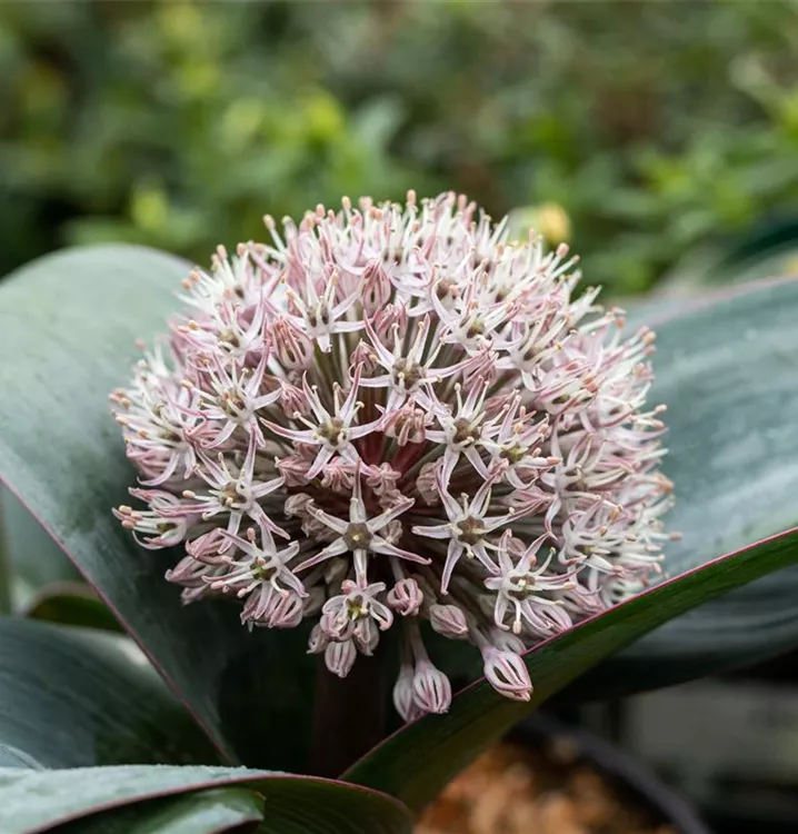 Aus der Mitte jedes Blattpaares schiebt sich im Frühjahr ein kurzer, aber kräftiger Blütenstiel, der etwa 20 Zentimeter hoch wird. Darauf sitzt ein großer, kugelförmiger Blütenstand mit 12 bis 15 cm Durchmesser, zusammengesetzt aus kleinen, silbrig-rosafarbenen, sternförmigen Einzelblüten. Die Blütezeit beginnt bereits im April und kann bis in den Mai hinein andauern. Die Samenstände bleiben noch einige Zeit rosa gefärbt, bevor sie strohfarben werden und schließlich zerfallen. Nach der Blüte vergilben die Laubblätter rasch.