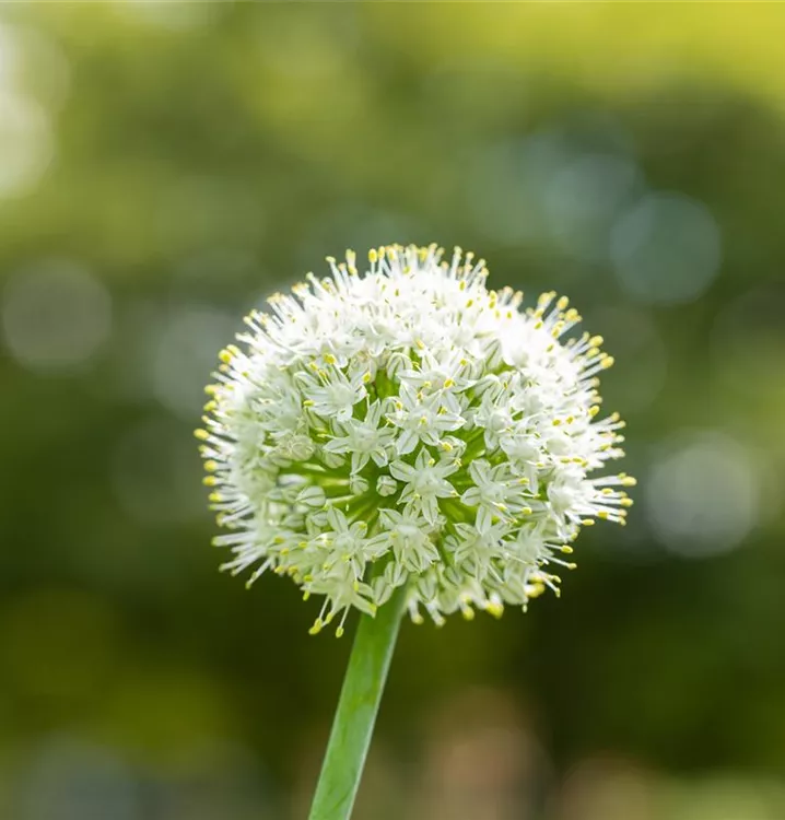 Der Stiel-Lauch stammt ursprünglich aus Zentralasien, insbesondere aus Afghanistan und Pakistan. Die Sorte 'Mount Everest' ist eine Hybride mit dichten, weißen, nahezu kugelförmigen Blütenständen, die einen Durchmesser von 8 bis 10 cm erreichen. Die sternförmigen Einzelblüten sind weiß und besitzen einen auffällig grünen Fruchtknoten. Beim Verblühen biegen sich die Blütenblätter leicht nac vorn. Das Laub beginnt bereits zur Blütezeit einzuziehen.