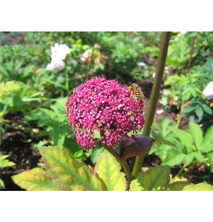 Angelica gigas bildet in Dolden angeordnete, dunkelrote Blüten ab Juli.