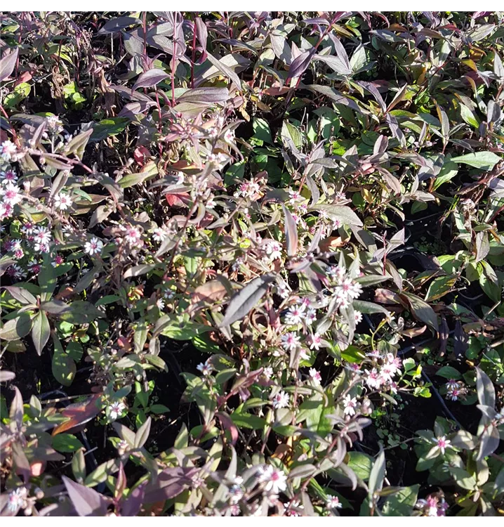 Die sommergrünen Blätter der Waagerechte Garten-Aster 'Prince' sind purpurrot, lanzettlich.
