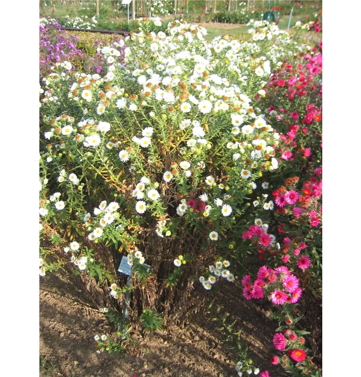 Die Garten-Raublatt-Aster 'Herbstschnee' (Aster novae-angliae) ist eine aufrechte Staude, die von September bis Oktober weiße, körbchenartige Blüten mit einem angenehmen Duft bildet. An einem sonnigen Standort mit durchlässigem, humosem, nährstoffreichem Boden erreicht sie gewöhnlich eine Höhe von ca. 1,4 m und wird ca. 1 m breit. Die Garten-Raublatt-Aster 'Herbstschnee' ist gut frostverträglich.