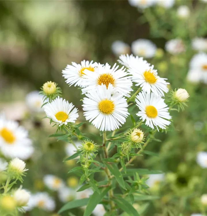 Aster novae-angliae 'Herbstschnee' bildet körbchenartige, weiße Blüten ab September. Diese verströmen einen angenehmen Duft.