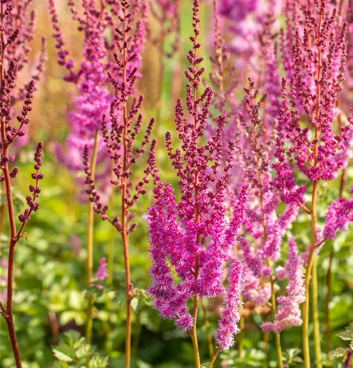 Astilbe chinensis var. taquetii 'Purpurkerze' bildet in Rispen angeordnete, purpurrote Blüten ab Juli.
