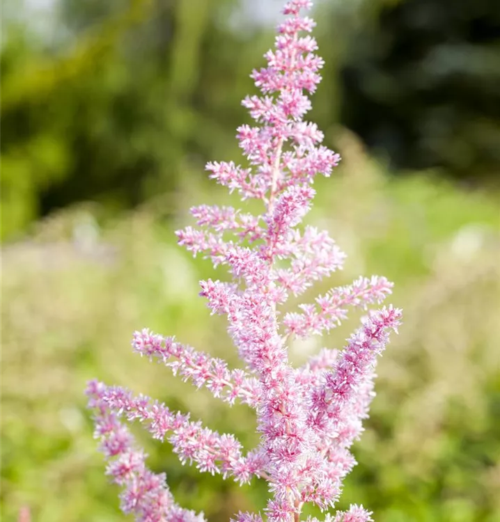 Astilbe x arendsii 'Bressingham Beauty' bildet in Rispen angeordnete, rosafarbene Blüten ab Juli.