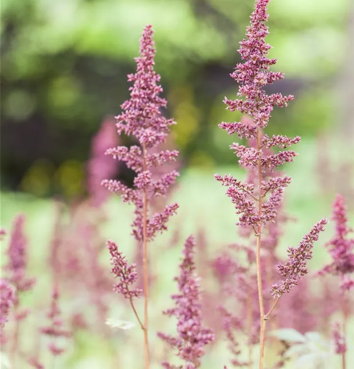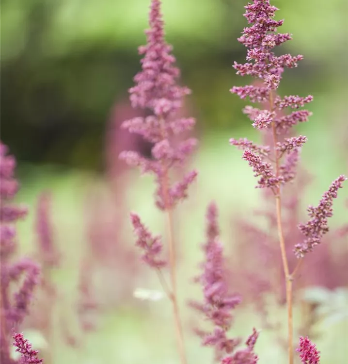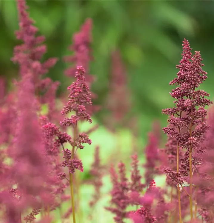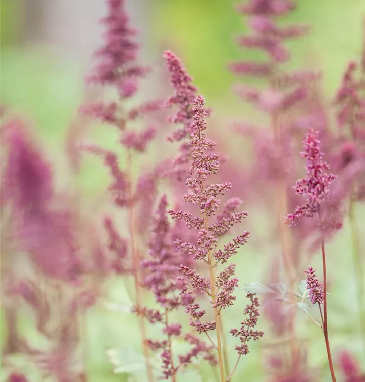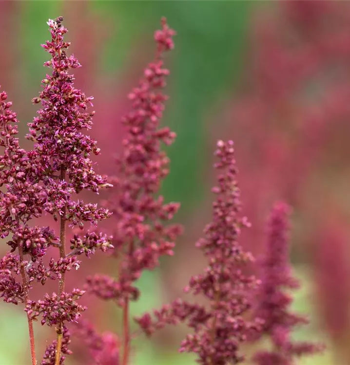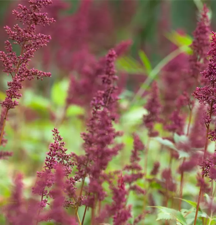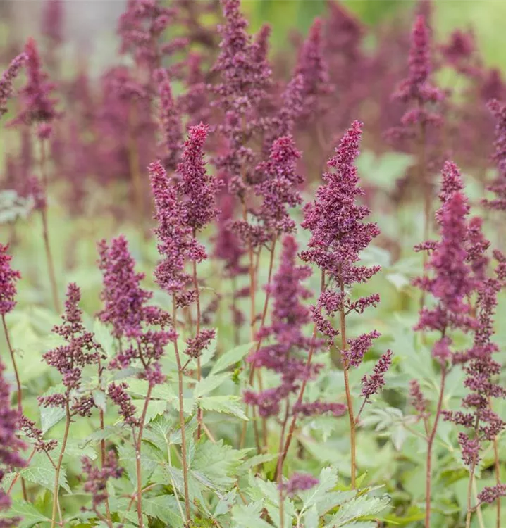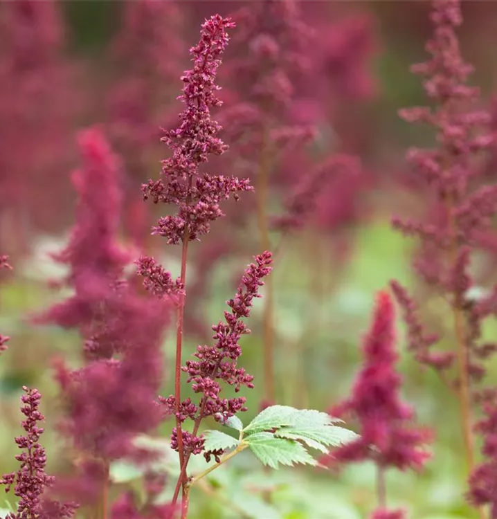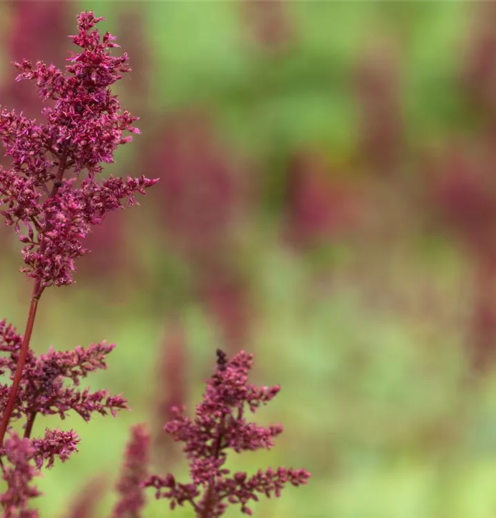 Astilbe x arendsii 'Fanal' bildet in Rispen angeordnete, purpurrote Blüten ab Juli.