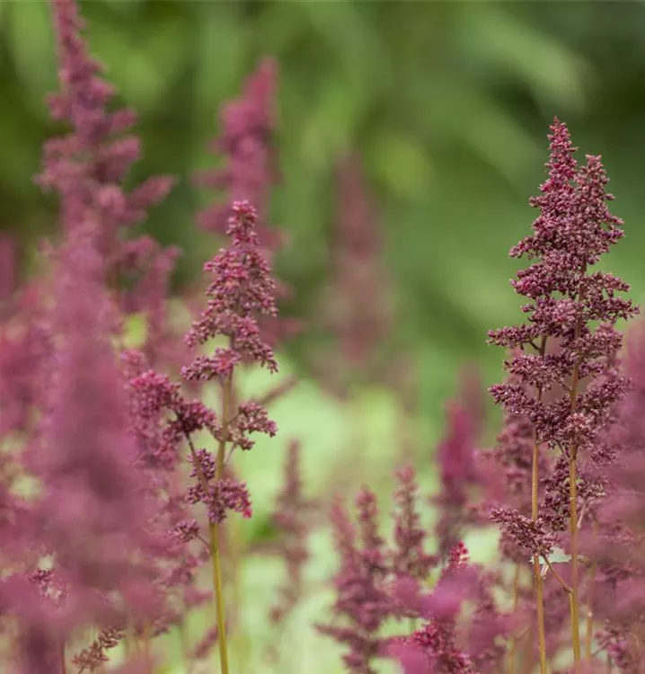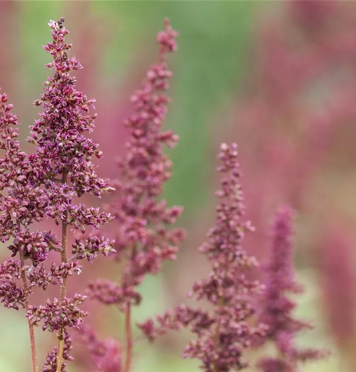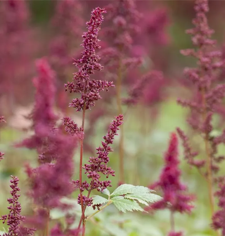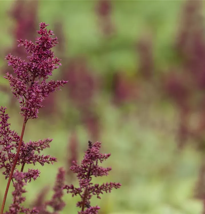Astilbe x arendsii 'Glut' bildet in Rispen angeordnete, karminrote Blüten ab Juli.