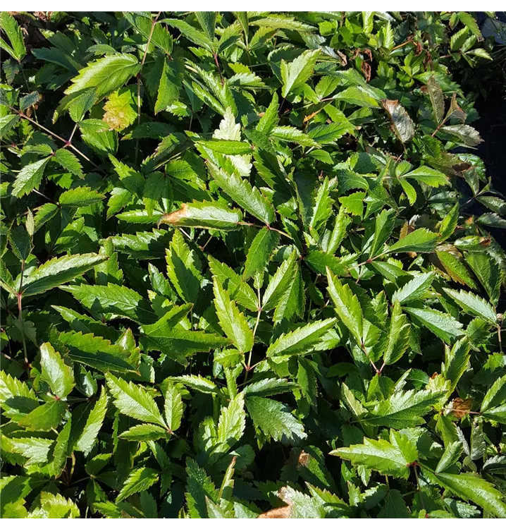 Die sommergrünen Blätter der Arends Garten-Prachtspiere 'Weiße Gloria' sind dunkelgrün, gefiedert.