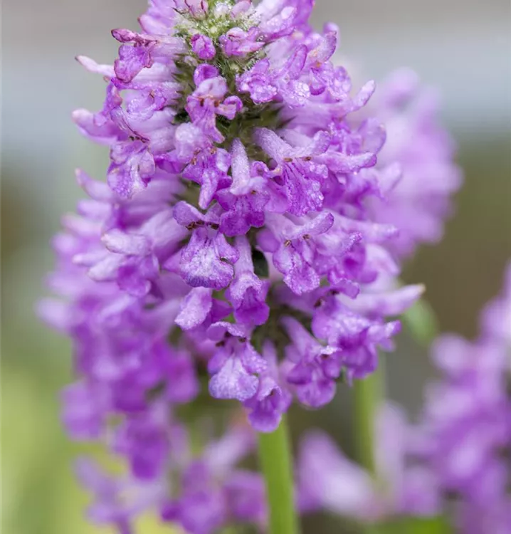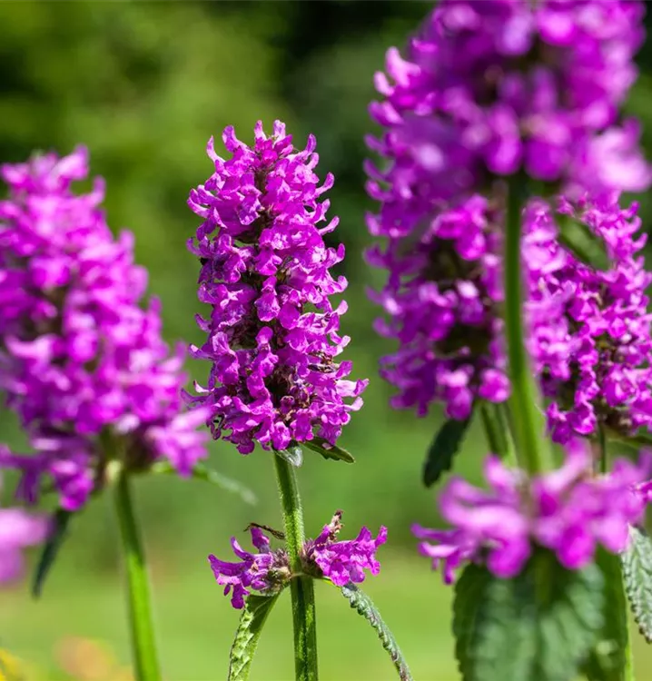 Betonica hirsuta 'Hummelo' bildet lippenförmige, in Quirle angeordnete, dunkelrosafarbene Blüten ab Juni.