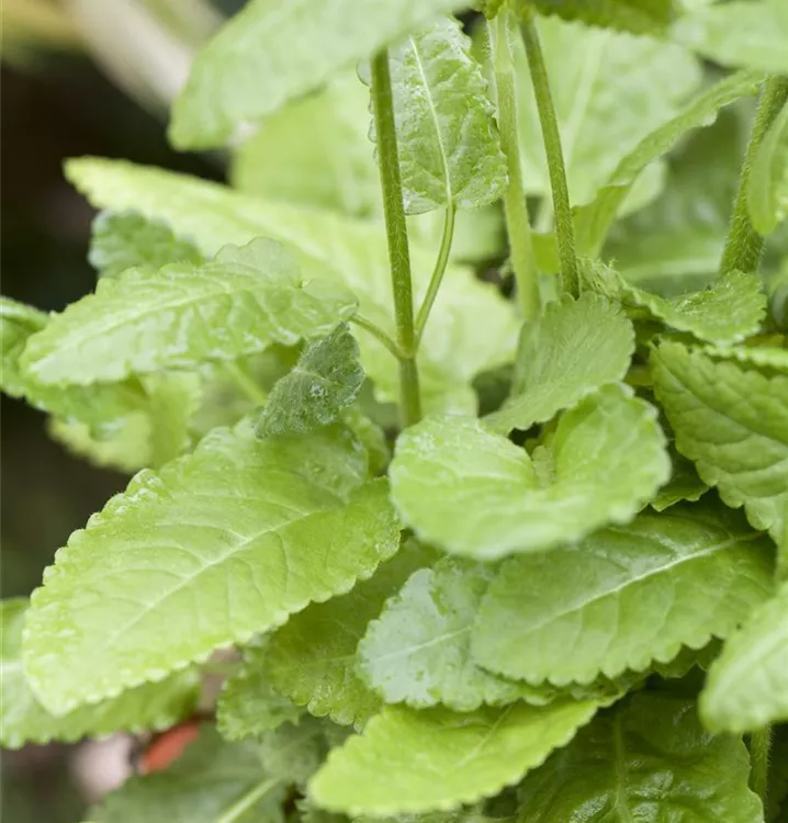 Die sommergrünen Blätter des Dichtblütiger Garten-Ziests 'Hummelo' sind dunkelgrün, herzförmig.