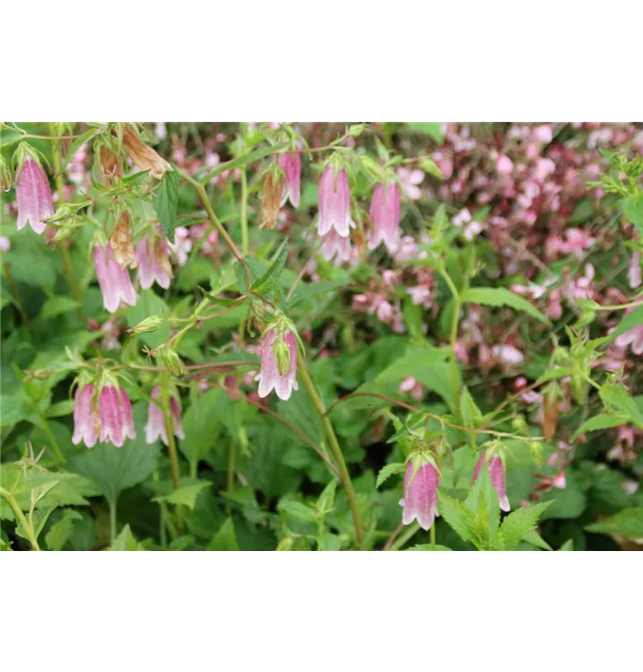 Campanula punctata 'Elisabeth' bildet glockenförmige, rosafarbene Blüten ab Mai.